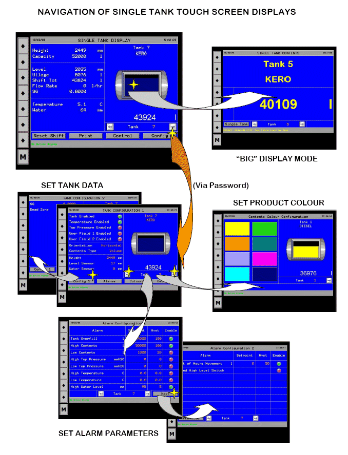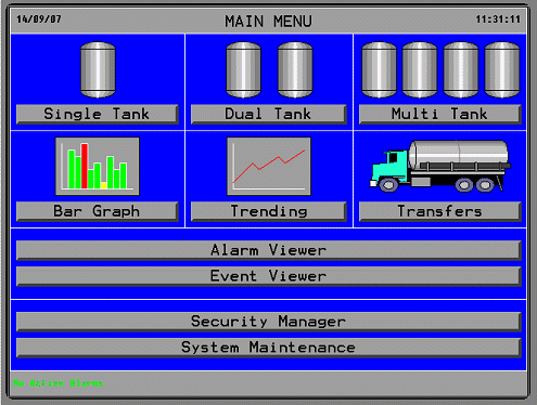 The system allows the system installer to configure up to five measuring devices on each of 24 tanks; potentially 120 variable parameters! E.g. level, flow, pressure, temperature, pH, etc